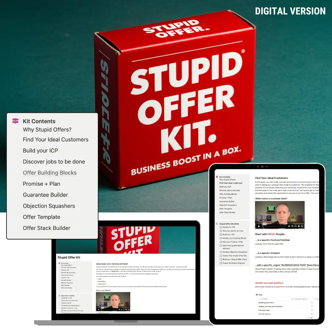 If there's one lesson I wish I'd known starting out as a Founder, it's that customers don't buy your product or service, they buy your offer. It's not the best product/service that wins, it's the offer that's easiest to say yes to. The best offers are so good, your ideal customers would be almost stupid to say no. The Stupid Offer Kit walks you step-by-step through the process of transforming your product or service into a stupidly compelling offer. Details here.