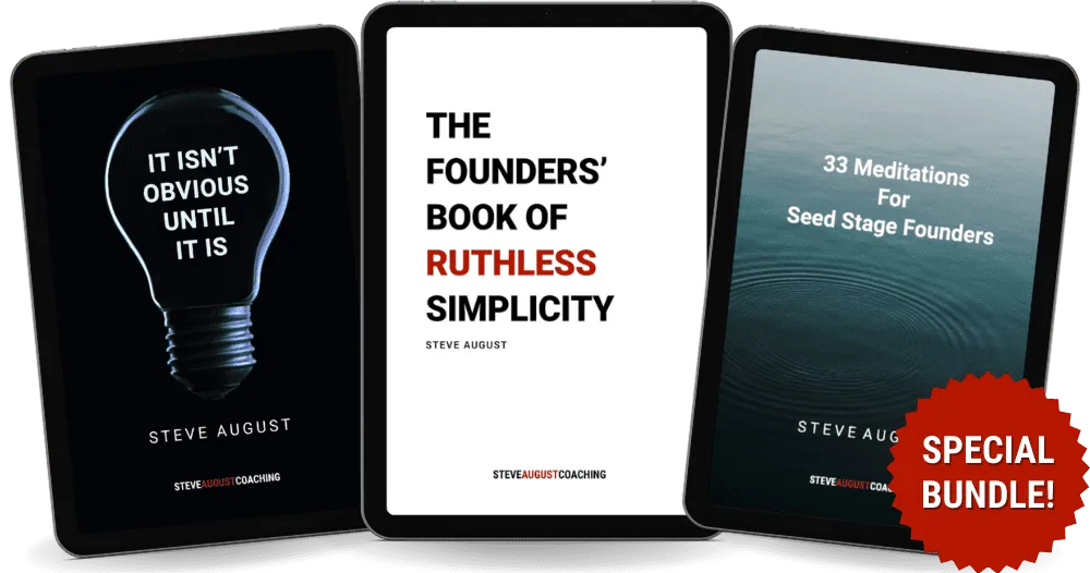 This bundle of 3 books and and an online course is for every Founder who is feeling stressed out and overwhelmed. You get 3 e-books: 33 Mediations for Seed Stage Founders, It Isn't Obvious Until It Is, and the Founders Book of Ruthless Simplicity + companion online course. Get your bundle here.